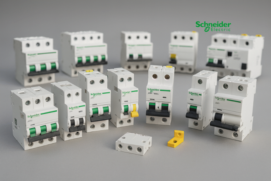 Lipapromet nudi punu liniju Acti9 automatskih prekidača s različitim nominalnim strujama, tipovima karakteristika i dodatnim modulima za profesionalne instalacije.