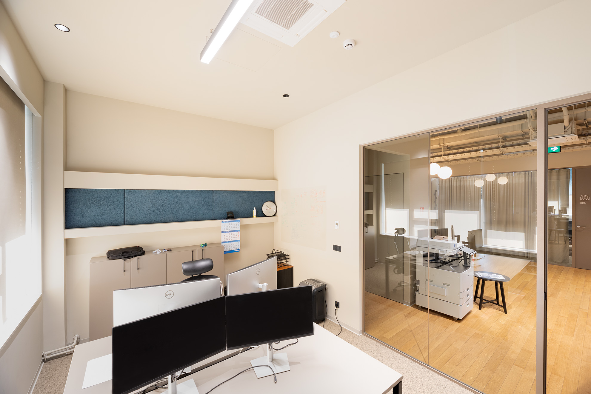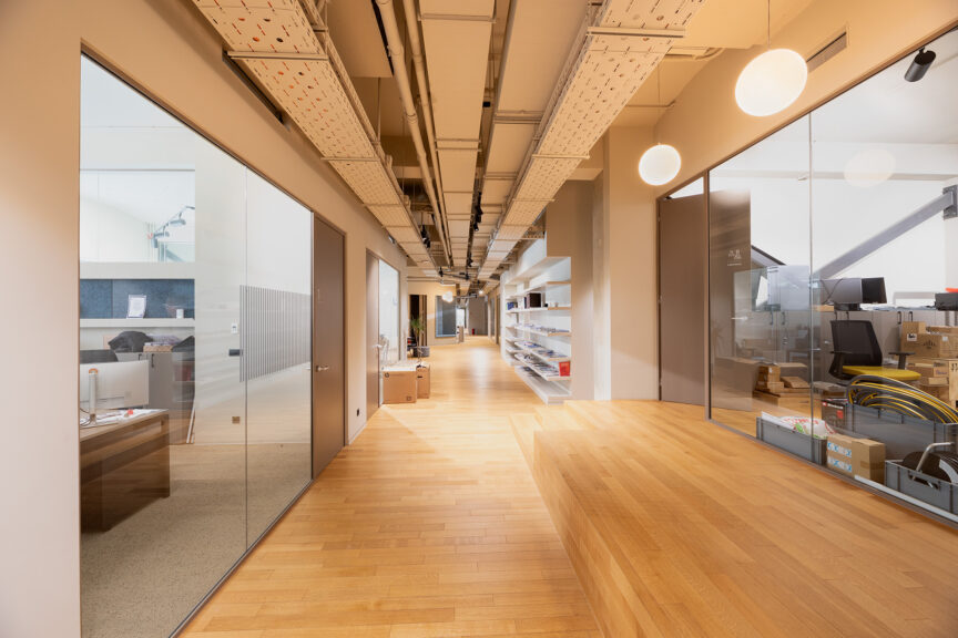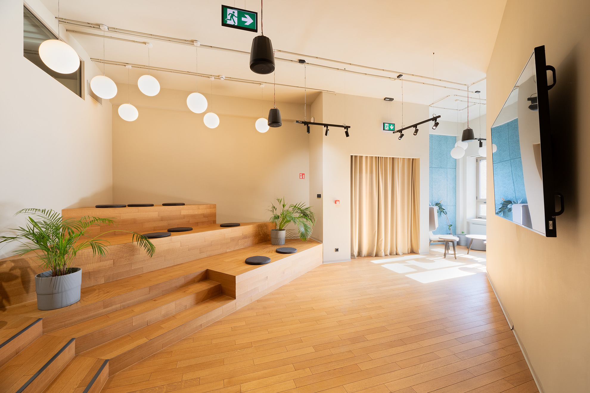 Rasvjeta je pažljivo integrirana kako bi naglasila kombinaciju modernih materijala (staklo, drvo, akustički paneli) i zadržane industrijske estetike.